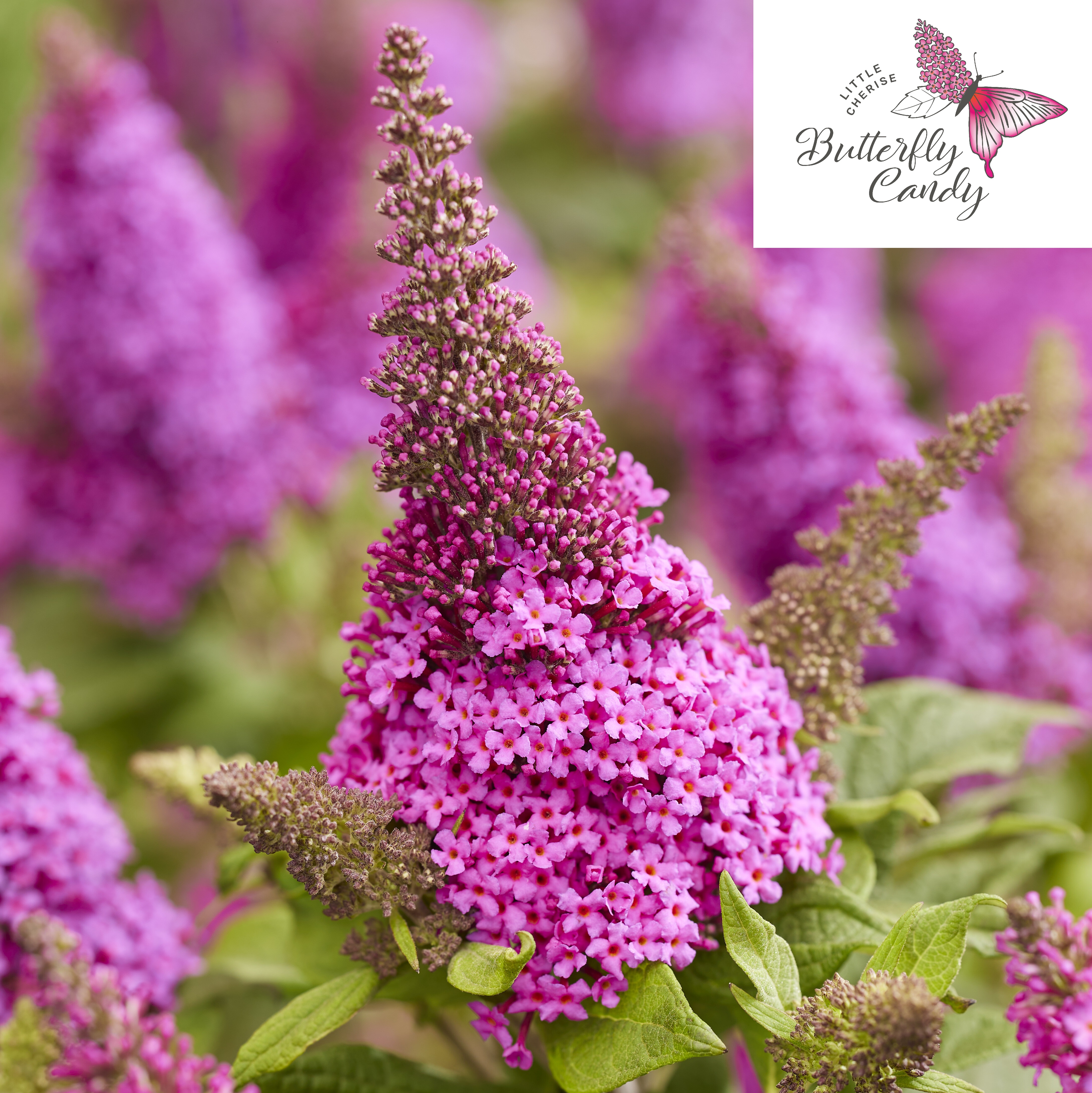 Der Sommerflieder 'Candy Little Cerise' (botanisch: Buddleja davidii) ist ein kompakt wachsender Zierstrauch, der mit seinen intensiv kirschrosa bis purpurfarbenen Blütenrispen einen lebendigen Akzent im Garten setzt. Die zahlreichen, dicht stehenden Einzelblüten bilden elegante, leicht aufrechte Rispen und verbreiten während der Blütezeit einen angenehmen Duft. Von Frühsommer bis in den Herbst hinein zeigt sich die Pflanze besonders blühfreudig und zieht mit ihren farbstarken Blüten viele Schmetterlinge und andere Insekten an. Das schmale, graugrün schimmernde Laub bildet einen attraktiven Hintergrund für die leuchtenden Blütenstände. Durch ihren kompakten Wuchs eignet sich diese Sorte hervorragend für kleinere Gärten, Staudenbeete oder auch für die Pflanzung in Kübeln auf Terrasse und Balkon.