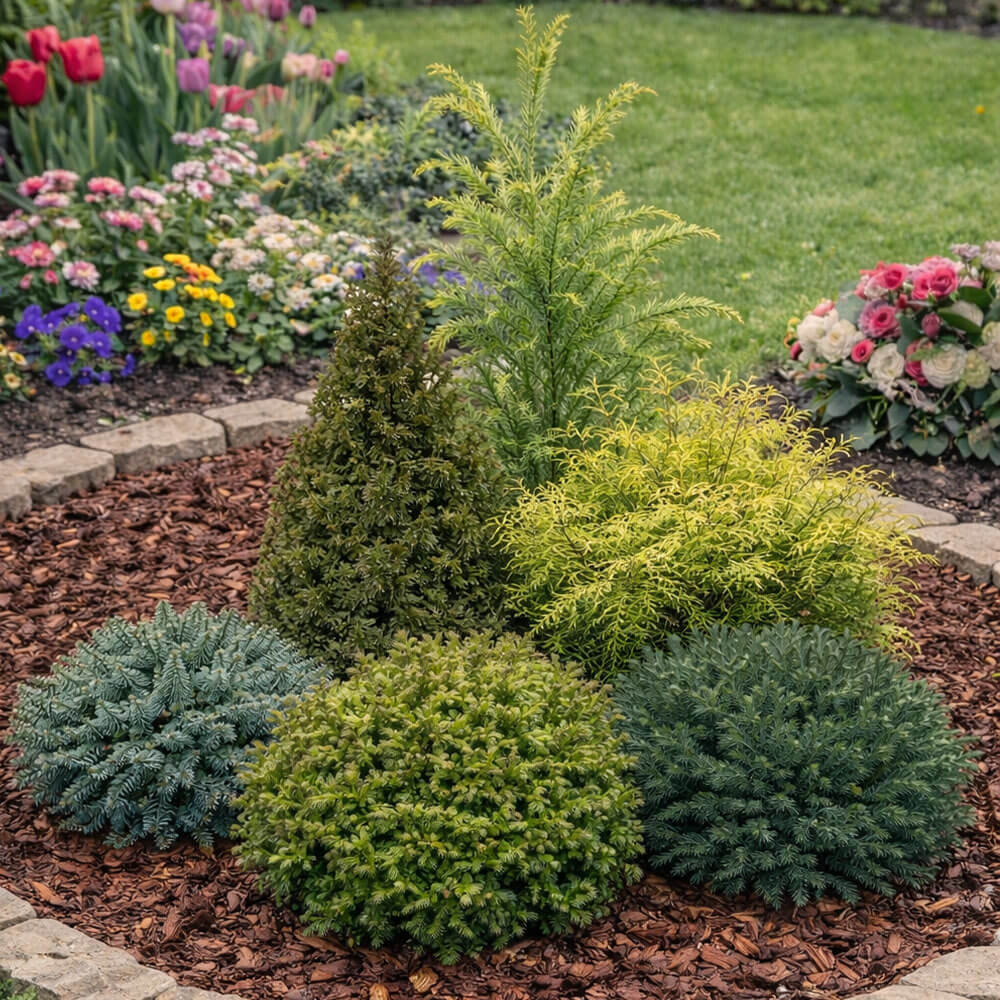 - Sechs verschiedene Koniferen-Sorten: Abendländischer Lebensbaum Primo, Hahnenkamm Sicheltanne, Hinoki Scheinzypresse Lucas, Blue Zwergzypresse Blue Moon, Zwergbalsamtanne Nana, Japanische Zwergsicheltanne Green Pearl
