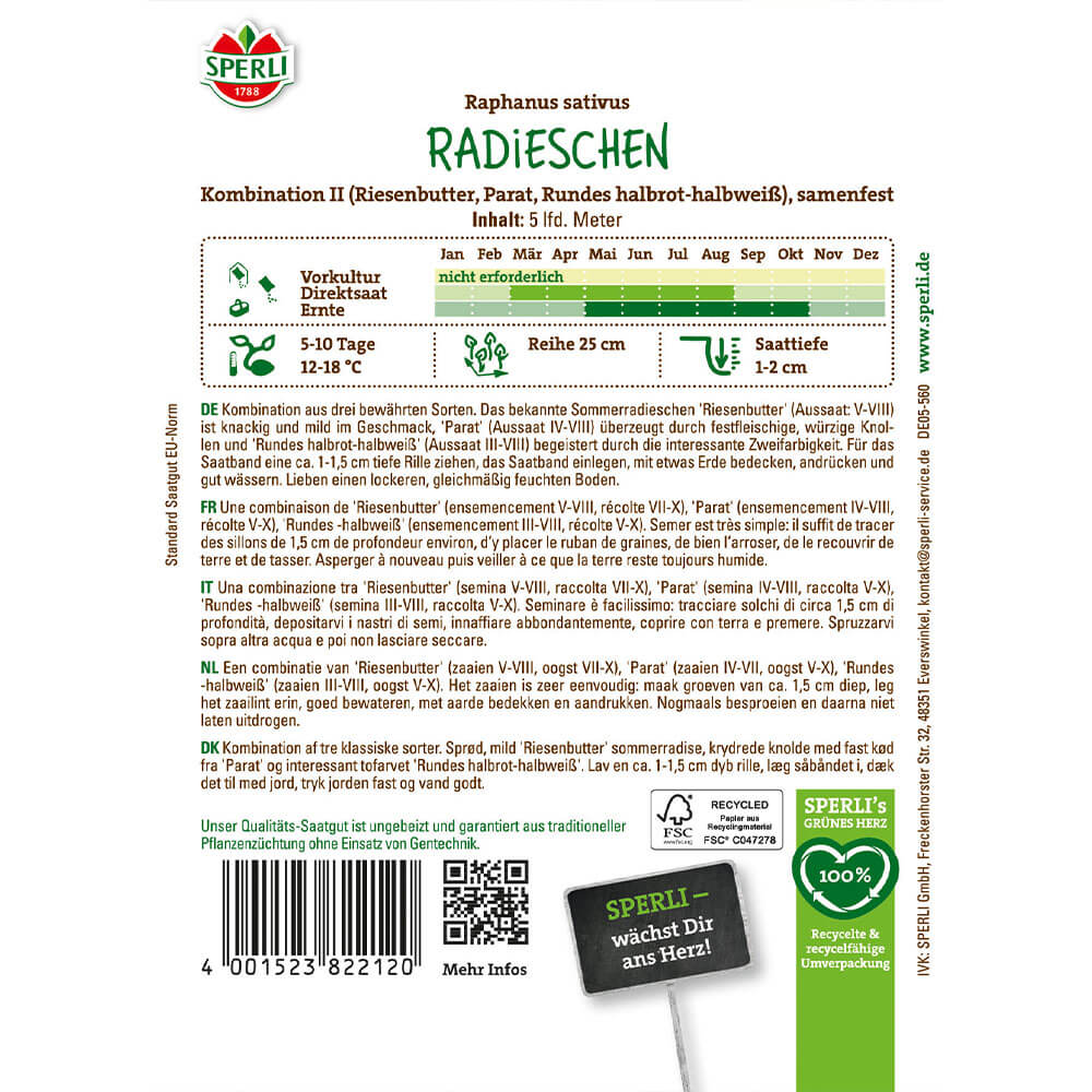 Die Radieschen 'Kombination II' enthält die drei Sorten 'Riesenbutter', 'Parat' und 'Rundes halbrot-halbweiß'. Die Sorte 'Riesenbutter' bildet runde und große Knollen und sehr kräftiges Laub. Zudem hat die 'Riesenbutter' eine geringe Neigung zur Pelzigkeit. 'Parat' ist ein Radies das nicht pelzig wird und schöne, große Knollen hat . Außerdem ist sie besonders festfleischig und ist von einer dünnen, karminroten Schale umgeben. Die Sorte 'Rundes halbrot-halbweiss' ist eine zweifarbige, mittelstark-wachsende, runde Sorte.