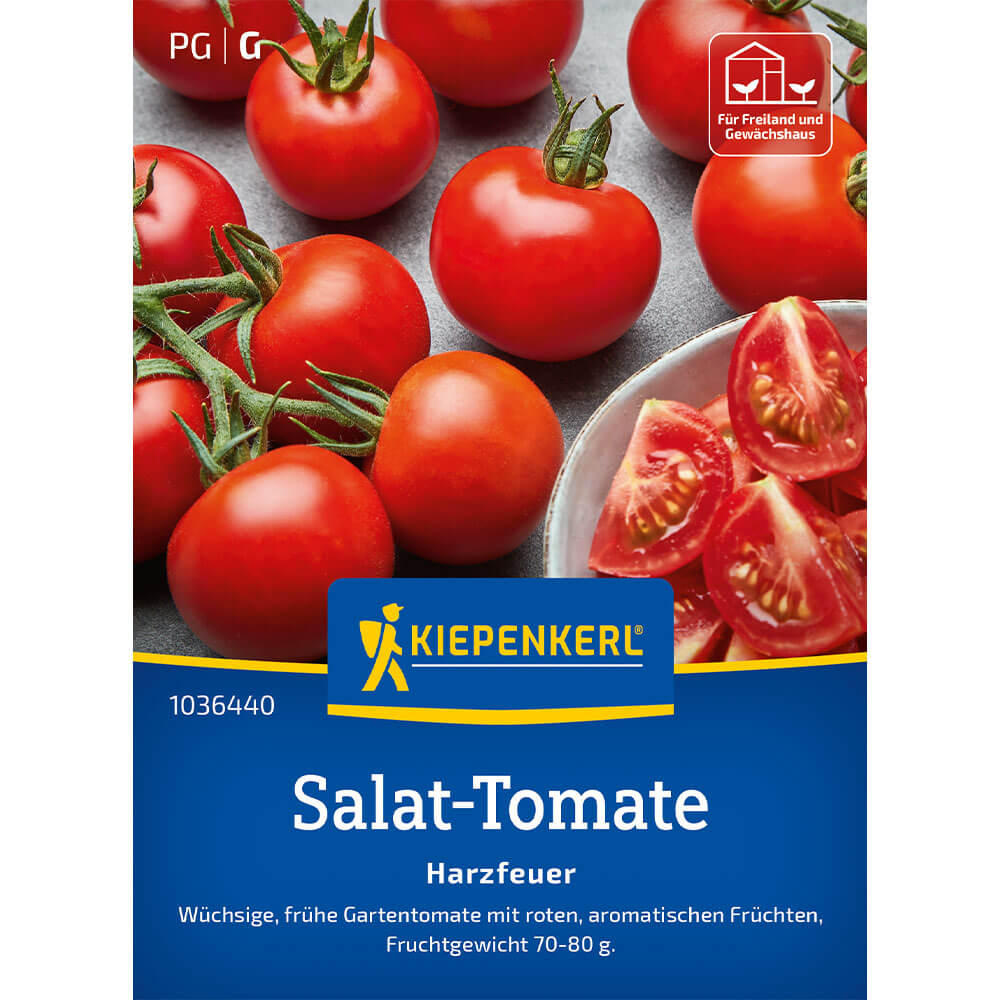Die Tomate Harzfeuer F1 (botanisch: Solanum lycopersicum Hybride) begeistert mit ihren tief roten, gleichmäßig reifenden Früchten von mittlerer bis größerer Größe, die sich durch eine feste, schnittfreudige Schale auszeichnen. Die Pflanzen wachsen als klassische Stabtomaten mit kräftigem Haupttrieb und entwickeln zahlreiche fruchttragende Seitentriebe, aus denen sich die reich bestückten Rispen von Früchten ergeben. Ihre dicht bewachsenen Pflanzen liefern im Sommer eine üppige Ernte: Die Früchte sind aromatisch im Geschmack und eignen sich ideal für den Frischverzehr, Salate oder Saucen.