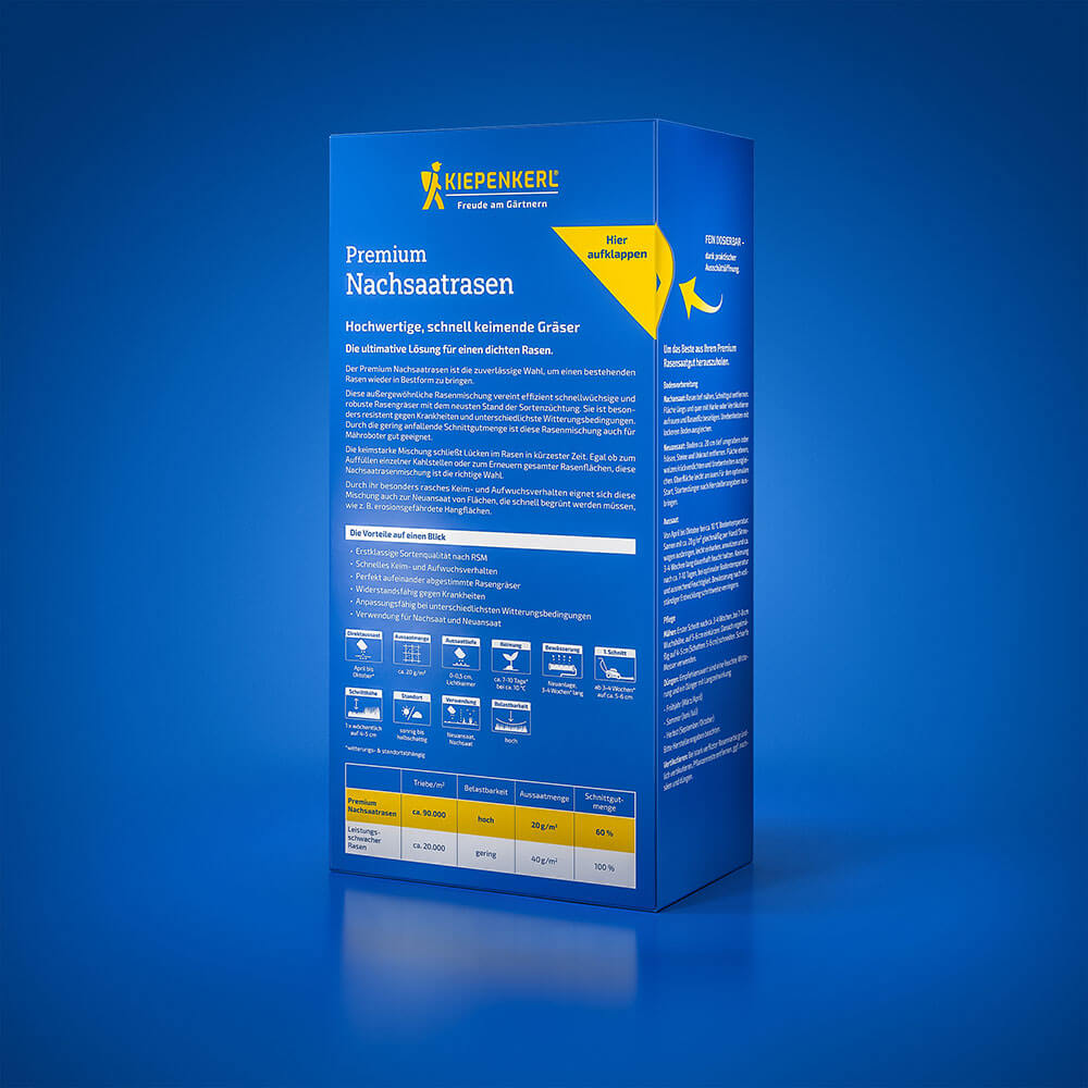 Lassen Sie Ihren Rasen wieder in neuem Glanz erstrahlen mit dem Kiepenkerl Profi-Line 'Complete' Nachsaatrasen, einer innovativen Lösung für jede Rasenerneuerung. Ob Hitzeschäden des Sommers, starke Beanspruchung durch Sport und Spiel oder unerwartete Lücken verursacht von Maulwürfen, Engerlingen, Ameisen und anderen: Diese Nachsaatmischung ist Ihr verlässlicher Partner für eine schnelle und nachhaltige Verjüngung und Erneuerung bestehender Rasenflächen. Die besonders schnellkeimenden Rasengräser schließen rasch größere Lücken und verdrängen Moos und Unkraut, sodass Sie sich über eine dichte, vitale und intensiv-grüne Rasenfläche freuen können.